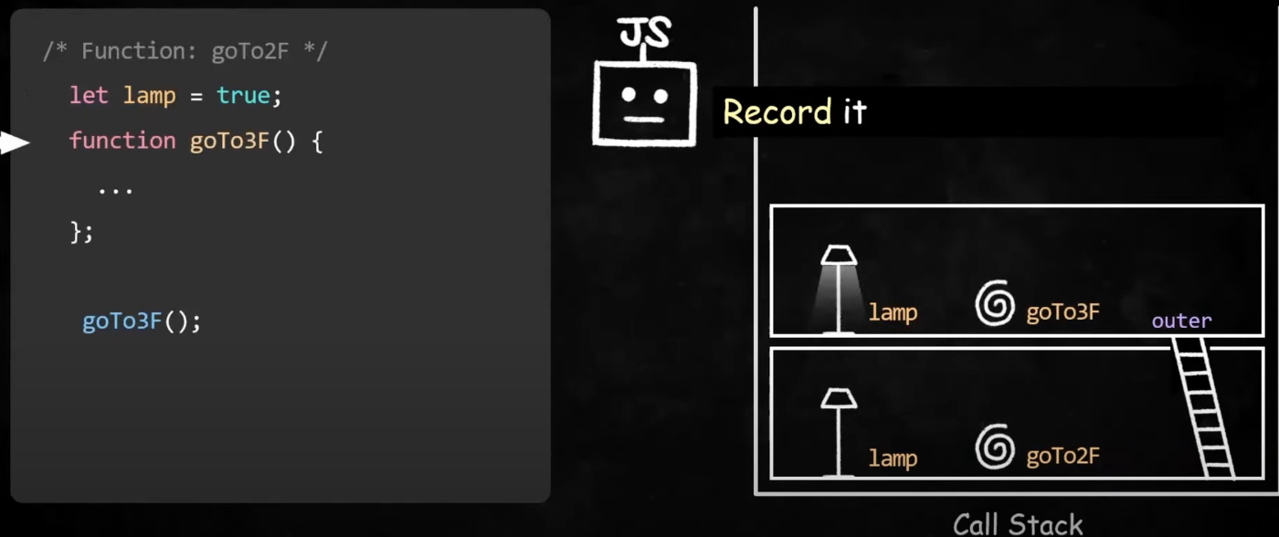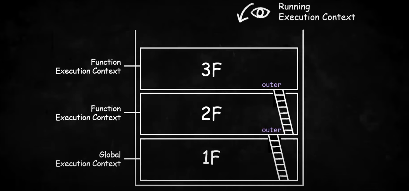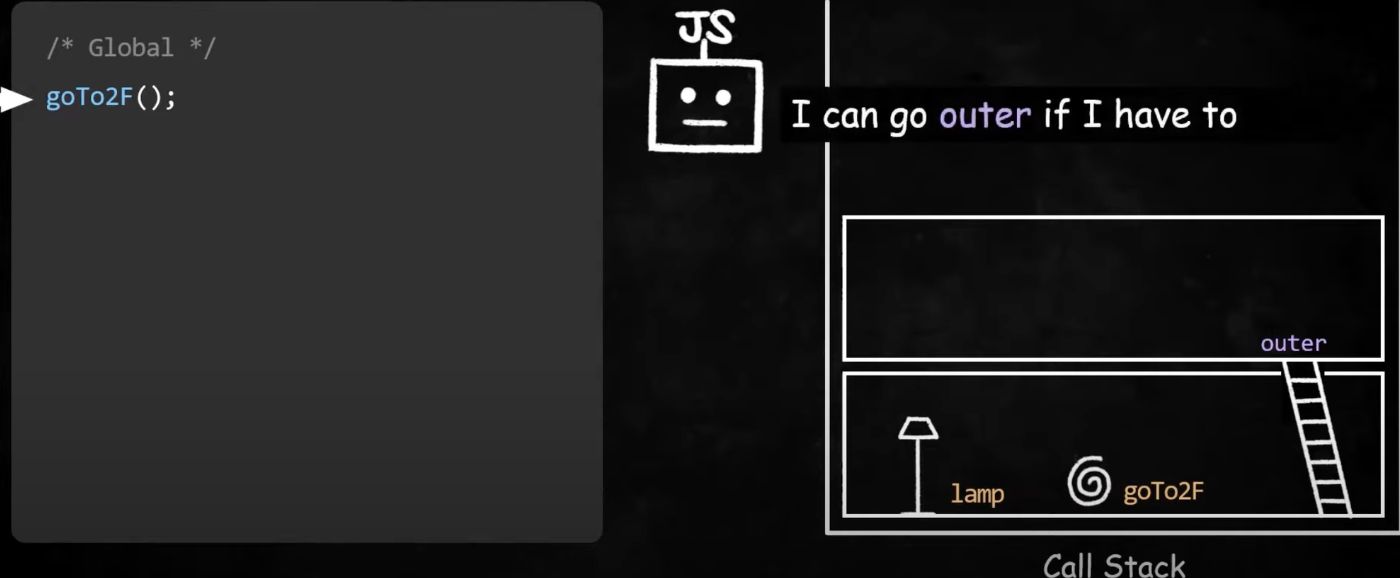다시 goTo2F 함수가 호출되는 시점으로 돌아가보면, 함수의 실행 컨텍스트를 새로 생성하고, 이때 새로 생성된 실행 컨텍스트에 바깥 렉시컬 환경으로 돌아갈 수 있는 outer를 남겨놓는다. 이제 필요한 경우에 이전 실행 컨텍스트의 환경레코드에 저장된 식별자도 참조할 수 있게되었다.