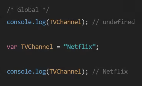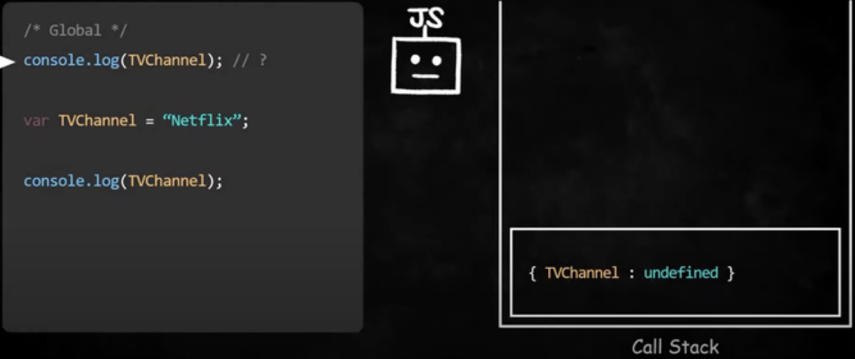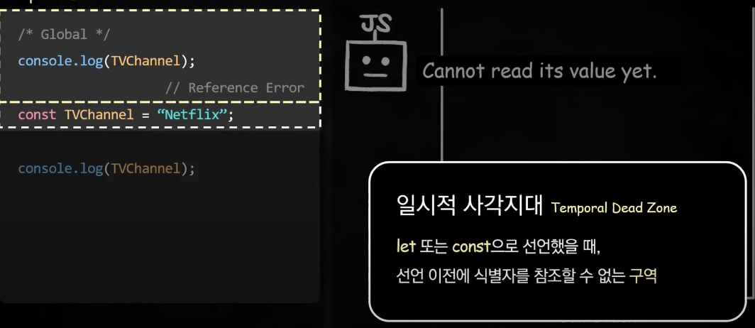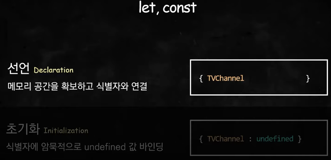 TVChannel 식별자를 기록해두긴 하지만 값을 초기화하지는 않는다. 따라서 선언문 이전에 TVChannel를 참조하려고 하면 Reference Error가 발생한다.