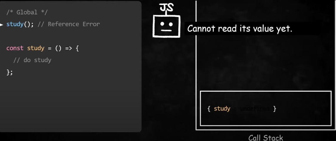 선언문 이전에 실행하려고 하면 환경레코드에 기록되어있는 값은 undefined이고 undefined라는 데이터타입은 함수와 달리 호출될 수 없기 때문에 타입 에러가 발생한다.< const, let >