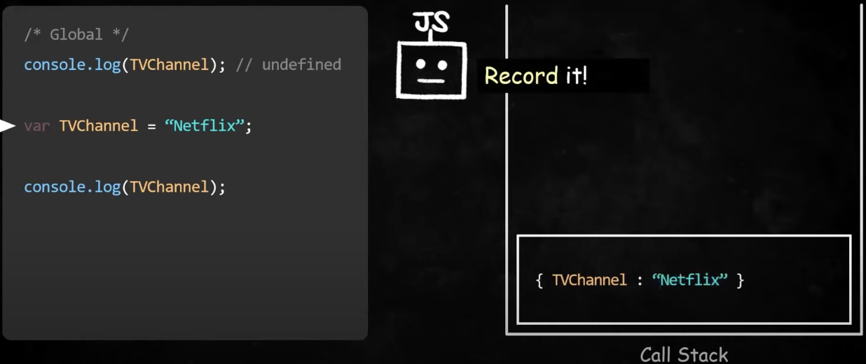 자바스크립트 엔진이 먼저 전체 코드를 스캔하면서 변수같은 정보를 실행컨텍스트의 'Record'에 미리 기록해놓기 때문이다.