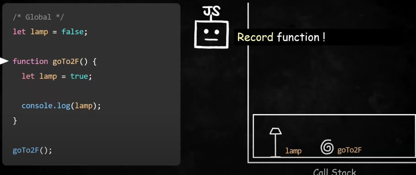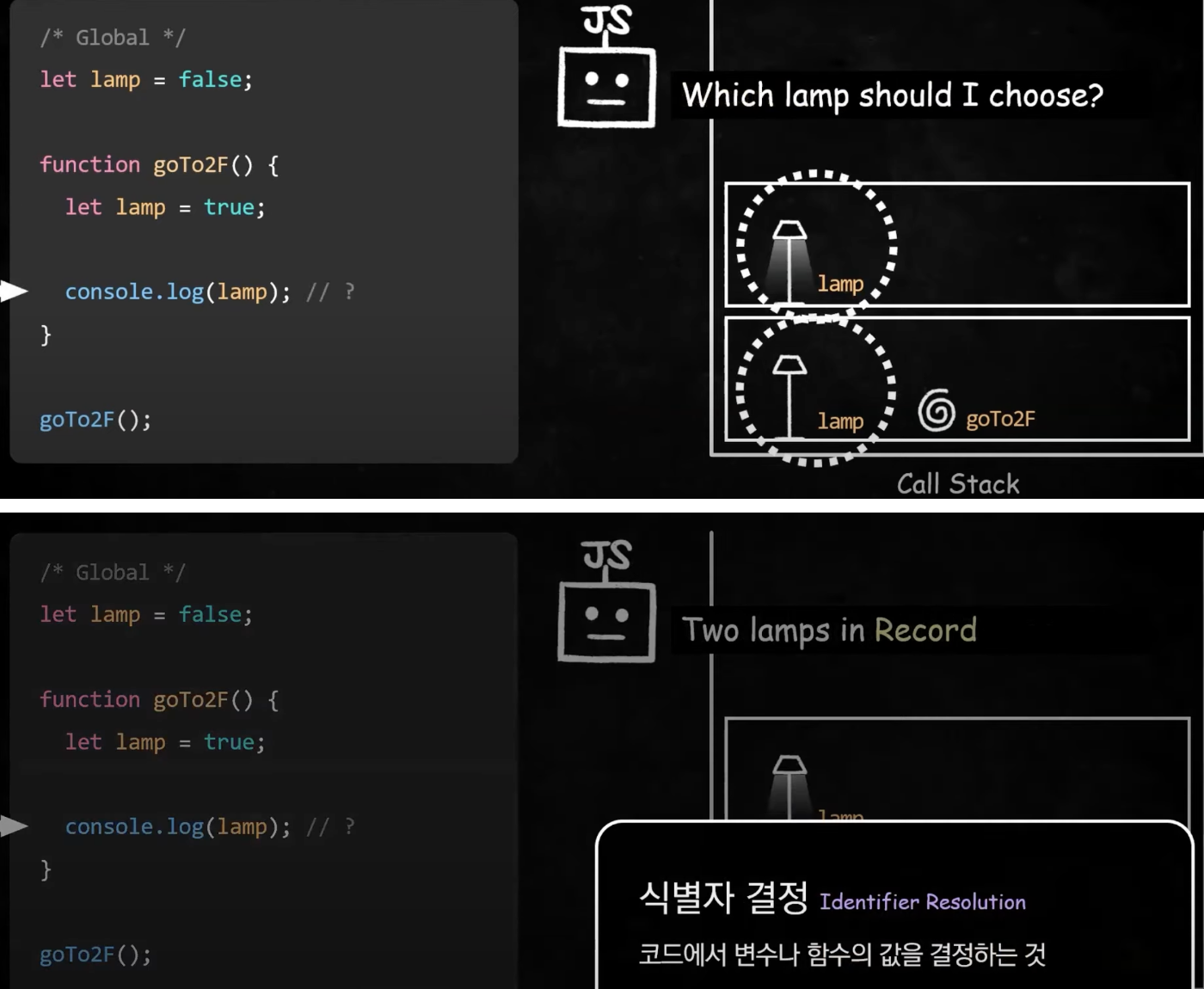 3. goTo2F 함수의 lamp = true 를 기록한다. 그리고 lamp의 값을 출력하려고 환경레코드를 보니, 불이 꺼진 lamp와 불이 켜진 lamp가 두개가 있다. 자바스크립트 엔진은 둘 중 뭘로 결정해야하나 고민에 빠진다. 이런 상황에서 변수나 함수의 값을 결정해내는 것을 ‘식별자 결정’이라고 한다.