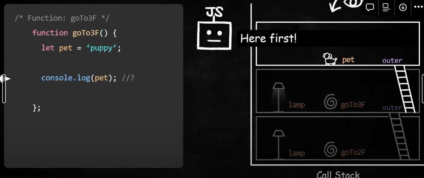3층에서 pet을 할당하고 원칙적으로 현재 활성화된 실행컨텍스트의 환경레코드를 먼저 보고