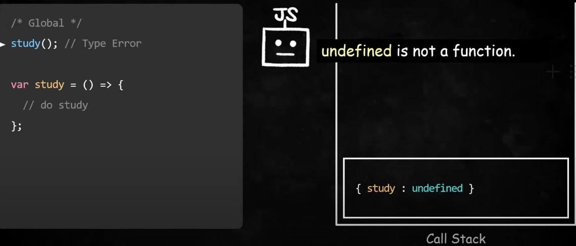 1. 함수 표현식은 var 키워드 일 때는 환경레코드의 값을 undefined로 초기화해두는데 undefined를 호출하려해서 Type Error가 나고, let&const 일 때는 환경레코드에 값을 초기화해두지는 않아서 참조하려니까 Reference Error가 난다.